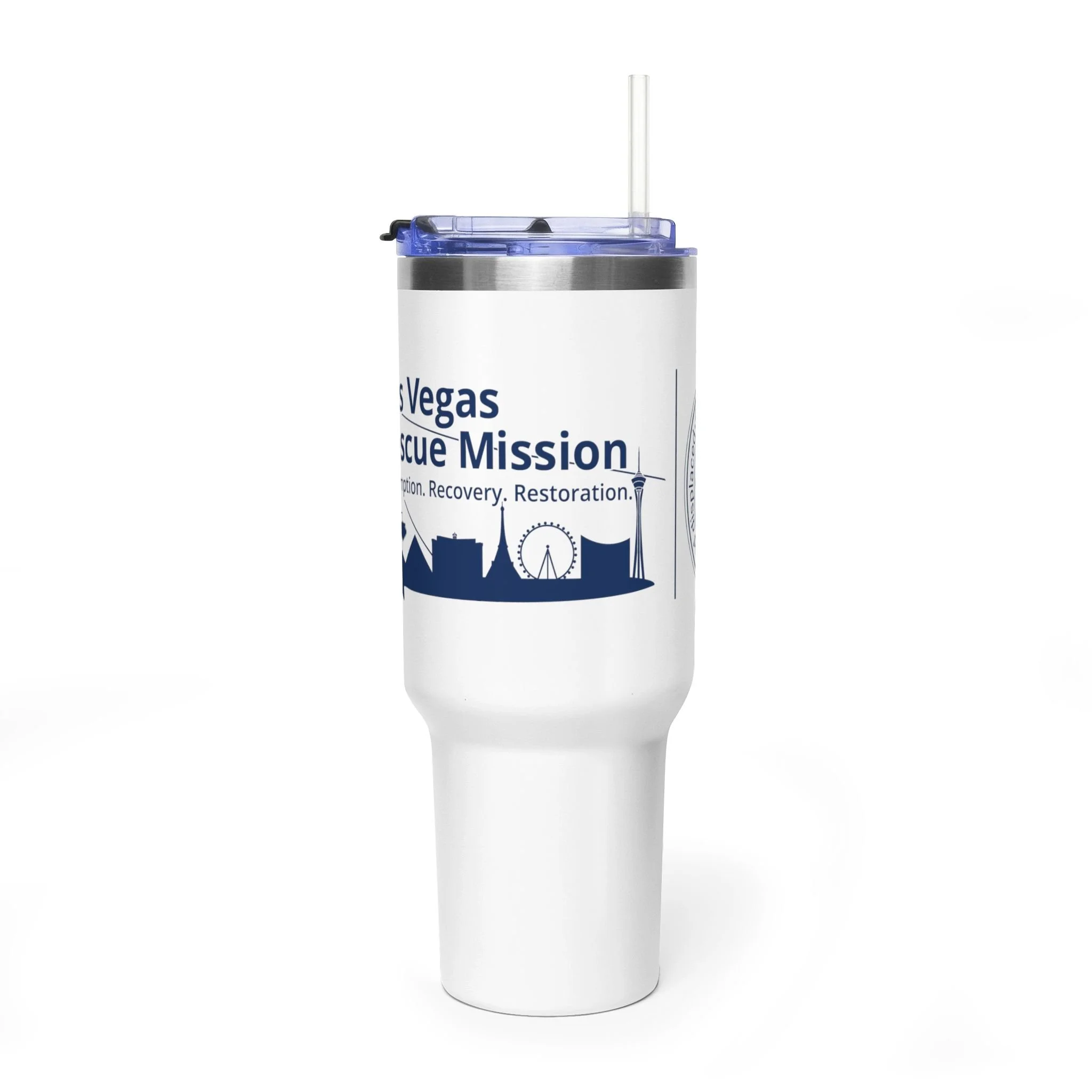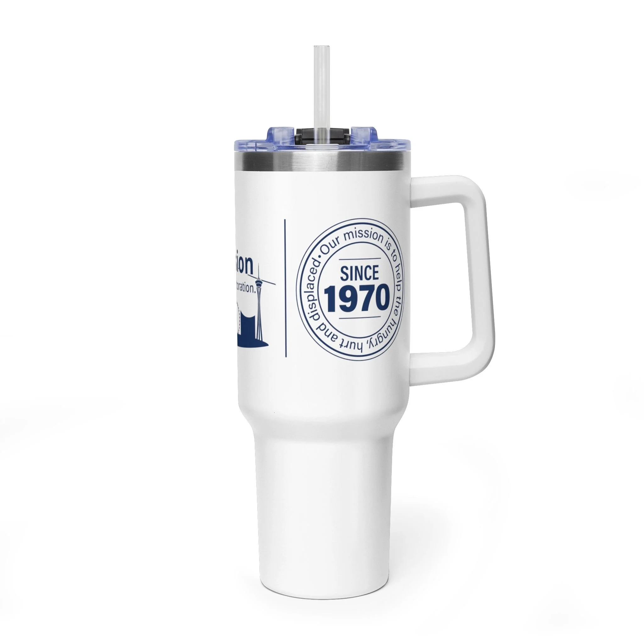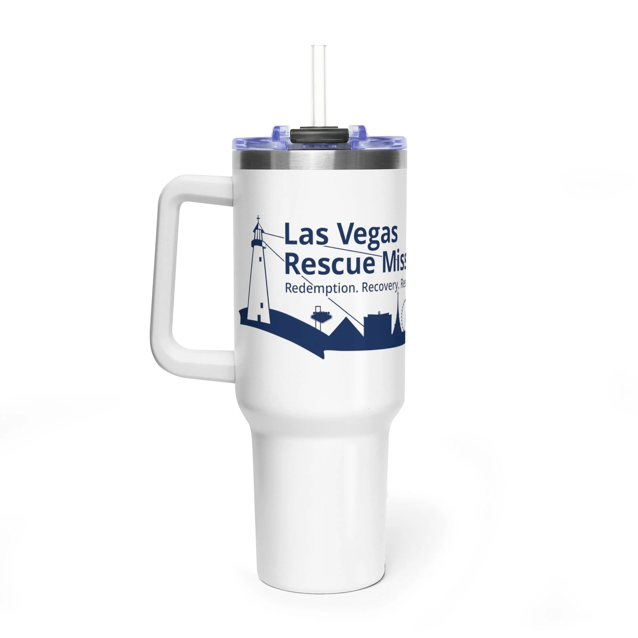 This 40oz vacuum thermal tumbler is built for long days, early morning shifts, and weekends on the move. Its double-wall stainless steel construction holds heat or chill for hours while the sturdy handle and rounded design make it easy to carry from the car to the office or a volunteer shift. The printed wrap showcases a clean navy design with lighthouse and skyline elements that speak to local pride and community service — a subtle, meaningful reminder of purpose with every sip. The re-sealable lid and durable straw keep drinks spill-resistant while the unprinted stainless rim adds a polished, authentic touch.